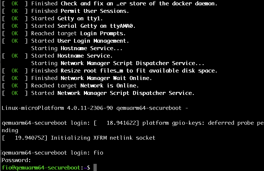 usernameandpasswordto log in your device after boot arefio/fio. We recommend changing them once you are in development.