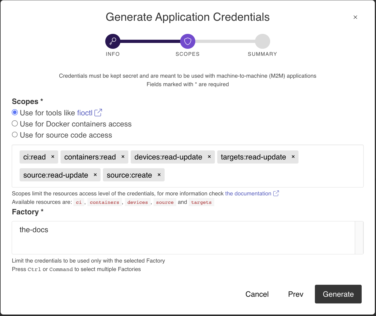 Check the Use for tools like fioctl box and select your Factory. You can revoke this access and set up a new credential later once you are familiar with the API Access.