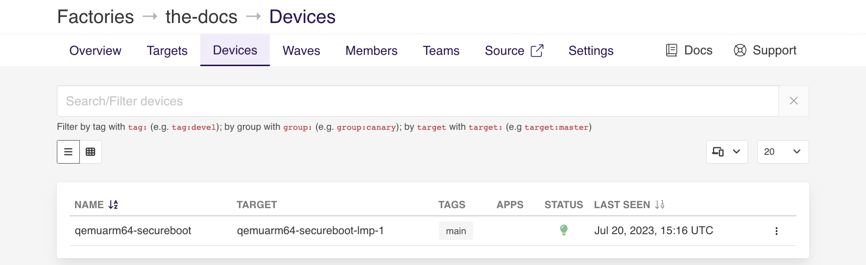 Your device is now registered and should be visible by navigating to the web interface and selecting the Devices tab for your Factory:
