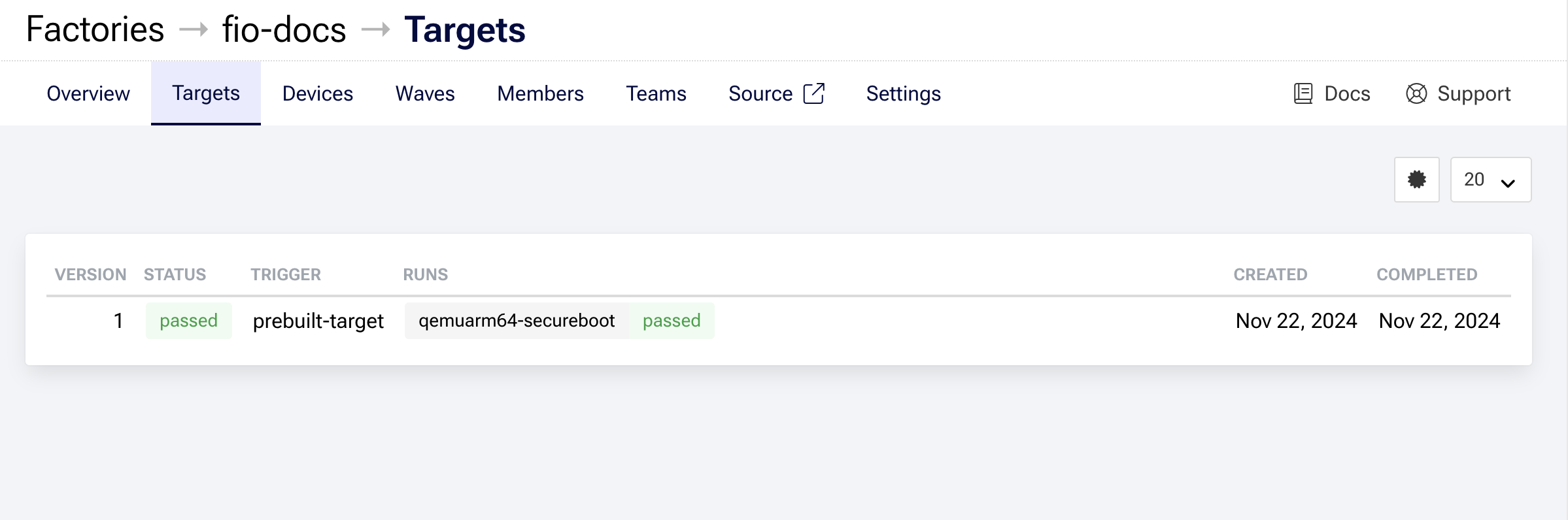 Targets are a reference to a platform image and Docker applications. When developers push code, FoundriesFactory produces a new Target. Registered devices then update and install Targets.