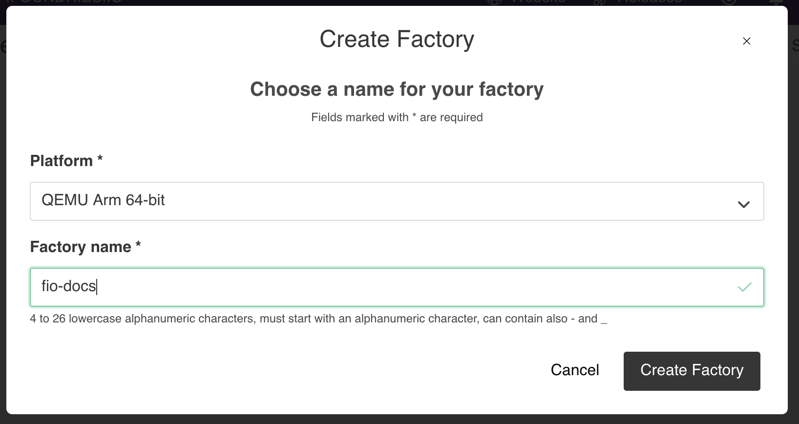 Choose a hardware platform from the dropdown menu in the Create Factory wizard and continue. Click Create Factory once your details are entered.