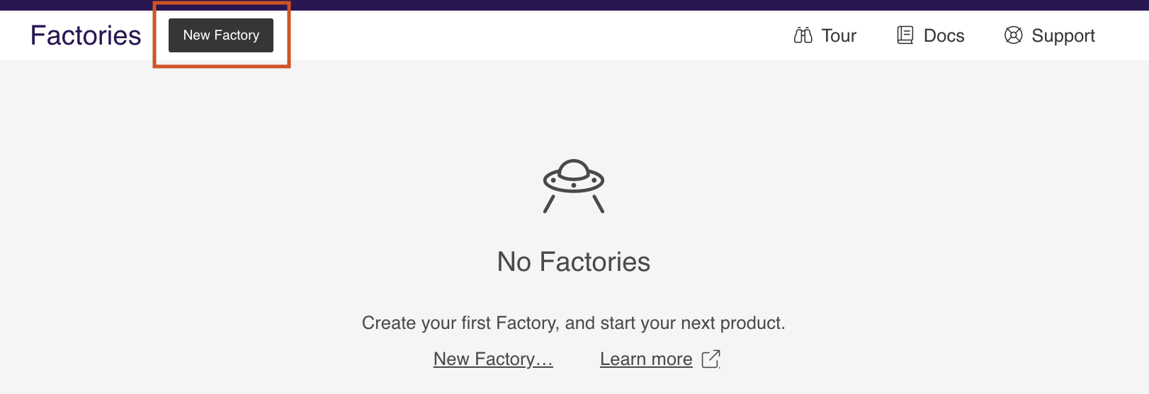 When your account is created, it is not associated with any factories. Create one by clicking New Factory.