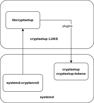 Storing the KEK is achieved through the use of LUKS2 tokens, making use of either the systemd-pkcs11 or systemd-tpm2 plugins (refer to systemd-cryptenroll for additional details).
