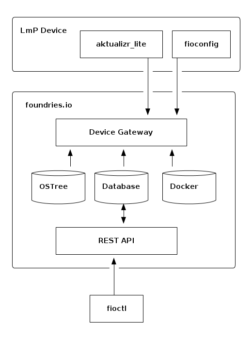 Aktualizr-lite and fioconfig run as separate daemons, periodically polling the device gateway with HTTP GET requests at configurable intervals.