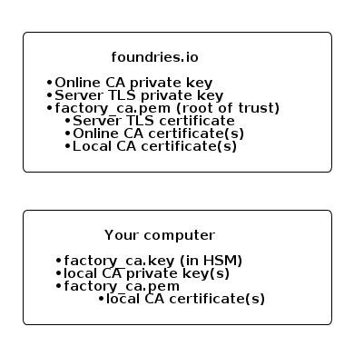 All intermediate Certificate Authorities (CAs) and TLS certificates configured in your Factory must be signed by its Root of Trust. The Root of Trust is preloaded to Factory devices so that they can use it to verify the FoundriesFactory web APIs TLS certificates.