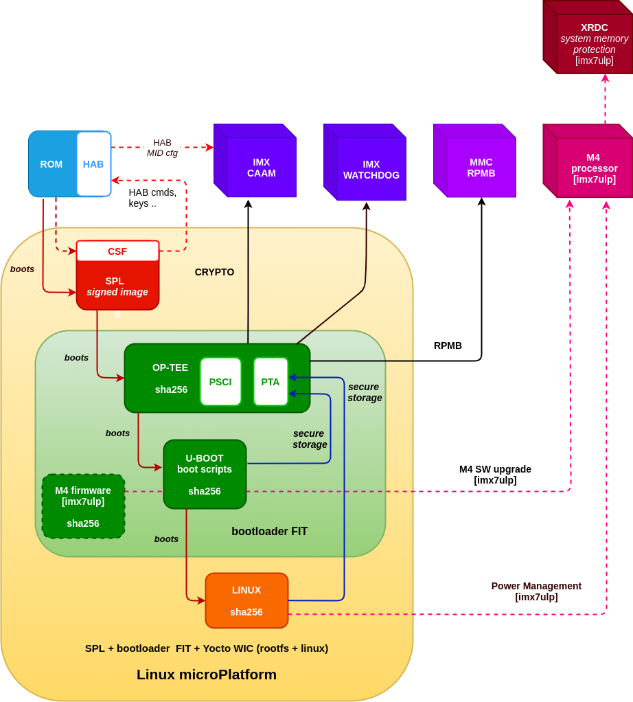 Systems using TF-A (ie, i.MX 8M*) are slightly different. The following diagrams describes the secure boot sequence with a succinct description of the Yocto Project meta-layer’s configuration for i.MX 8MM based platforms with TF-A: