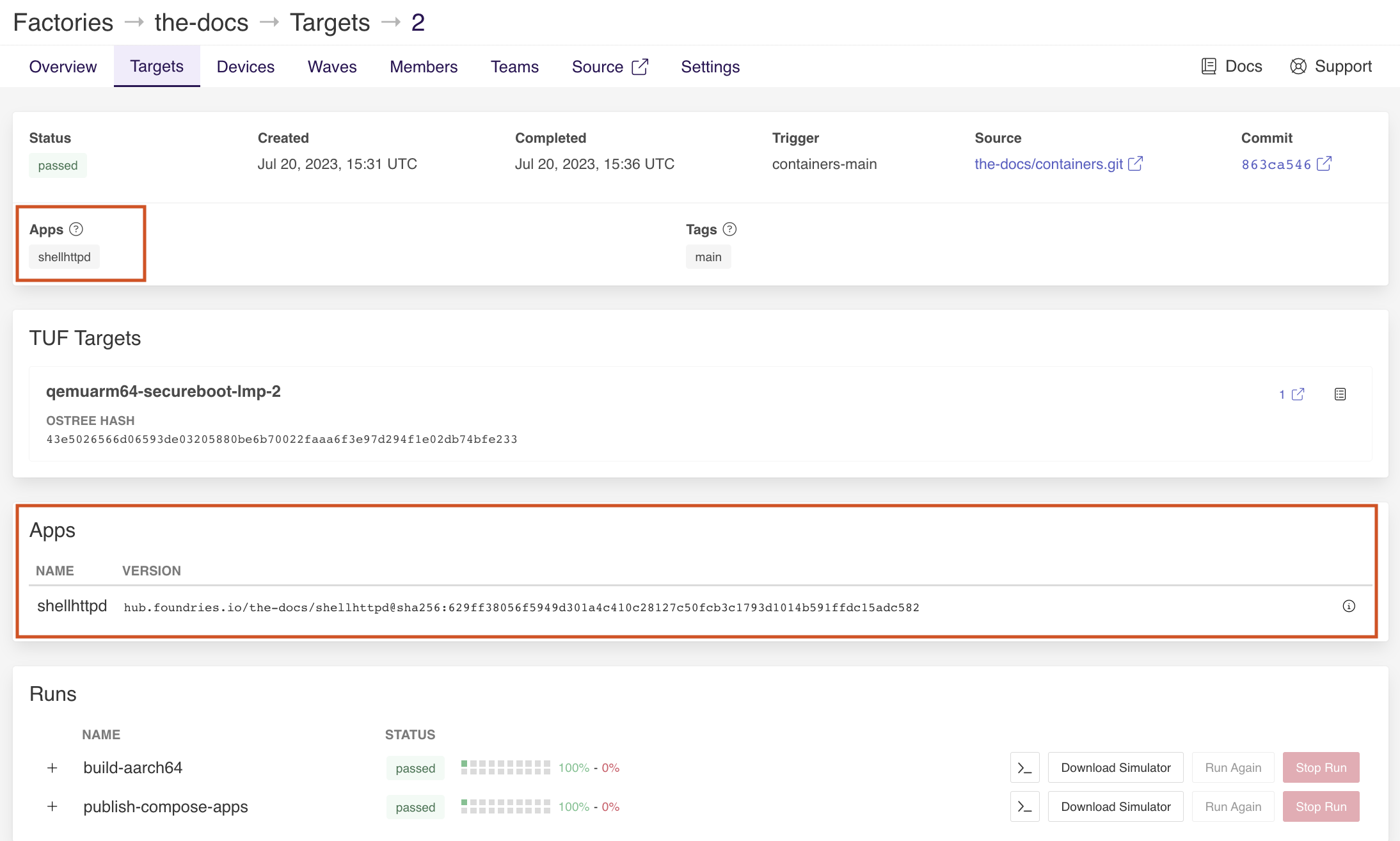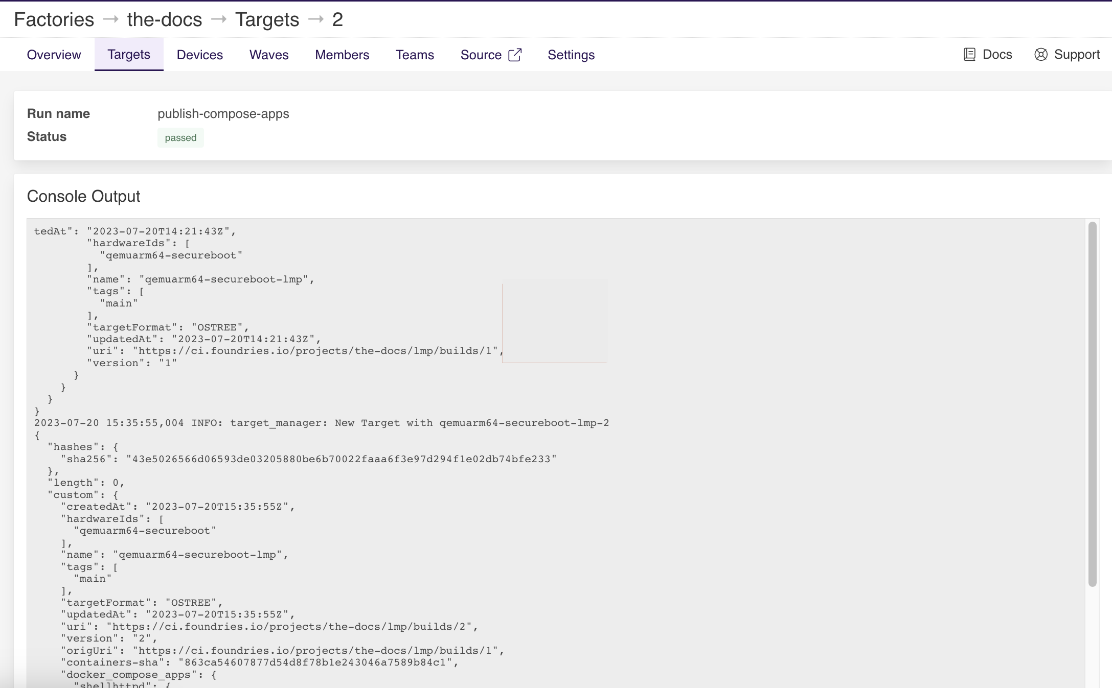 Once your changes to the containers.git repository were pushed, the FoundriesFactory™ Platform CI automatically started a new container-main build. Go to https://app.foundries.io, select your Factory and click on Targets: