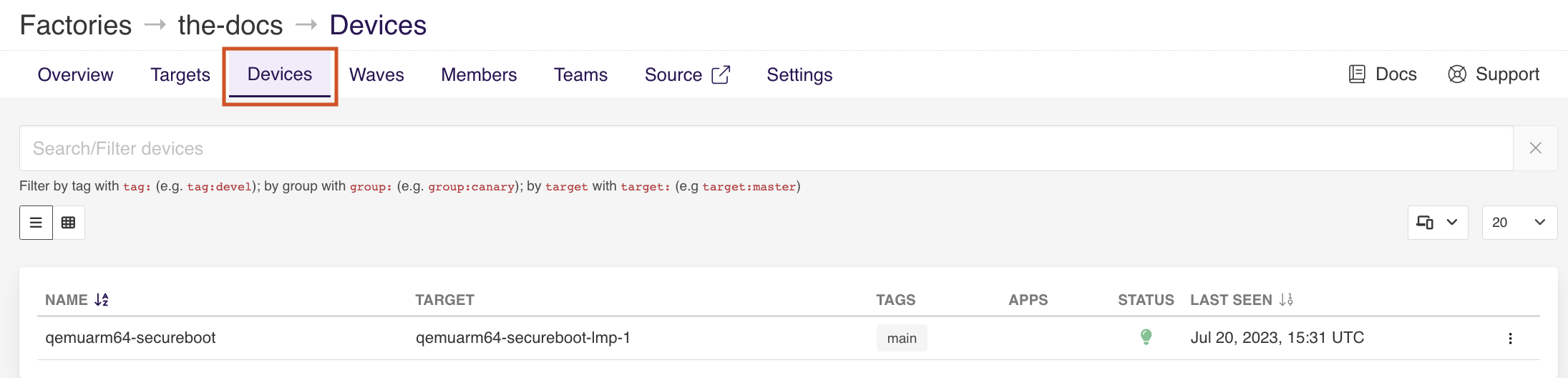 To check your device configuration, click on the Factory tab devices and find the column TAGS: