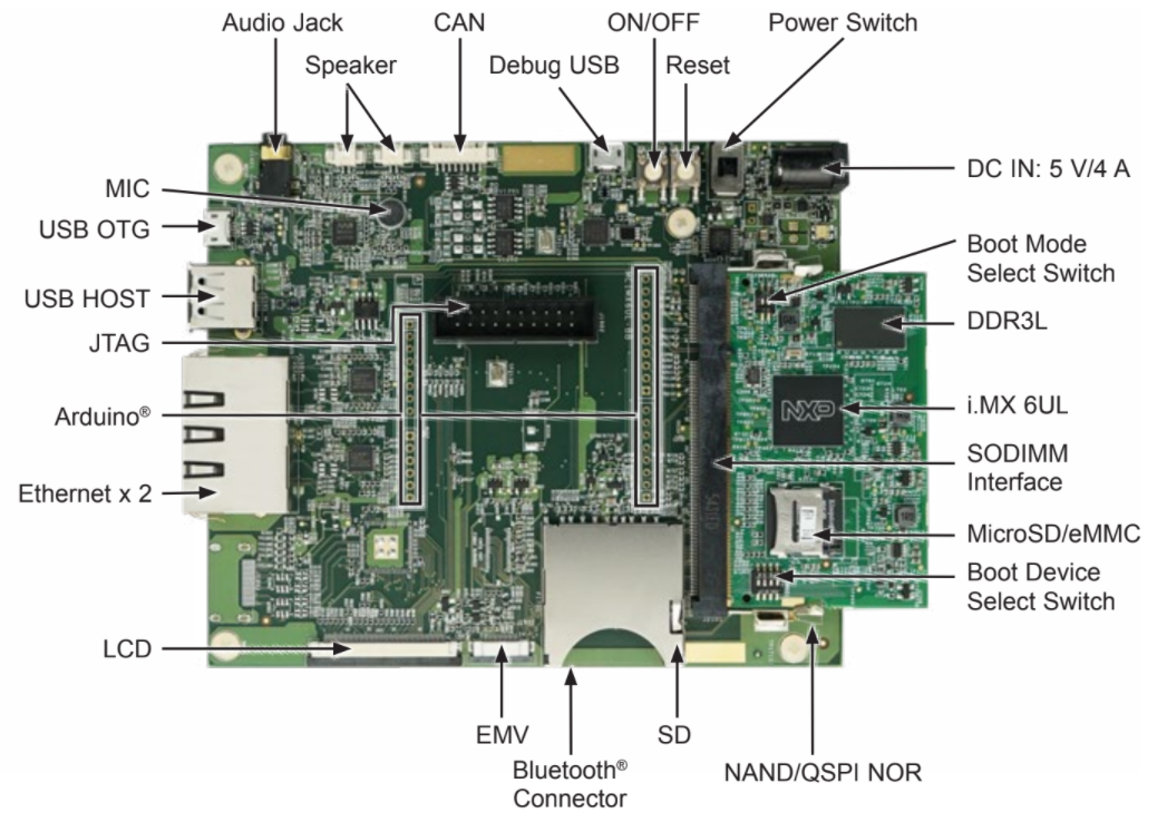 PowerJ2001 jack.Power on the imx6ulevk board by sliding power switch SW2001 to ON.
