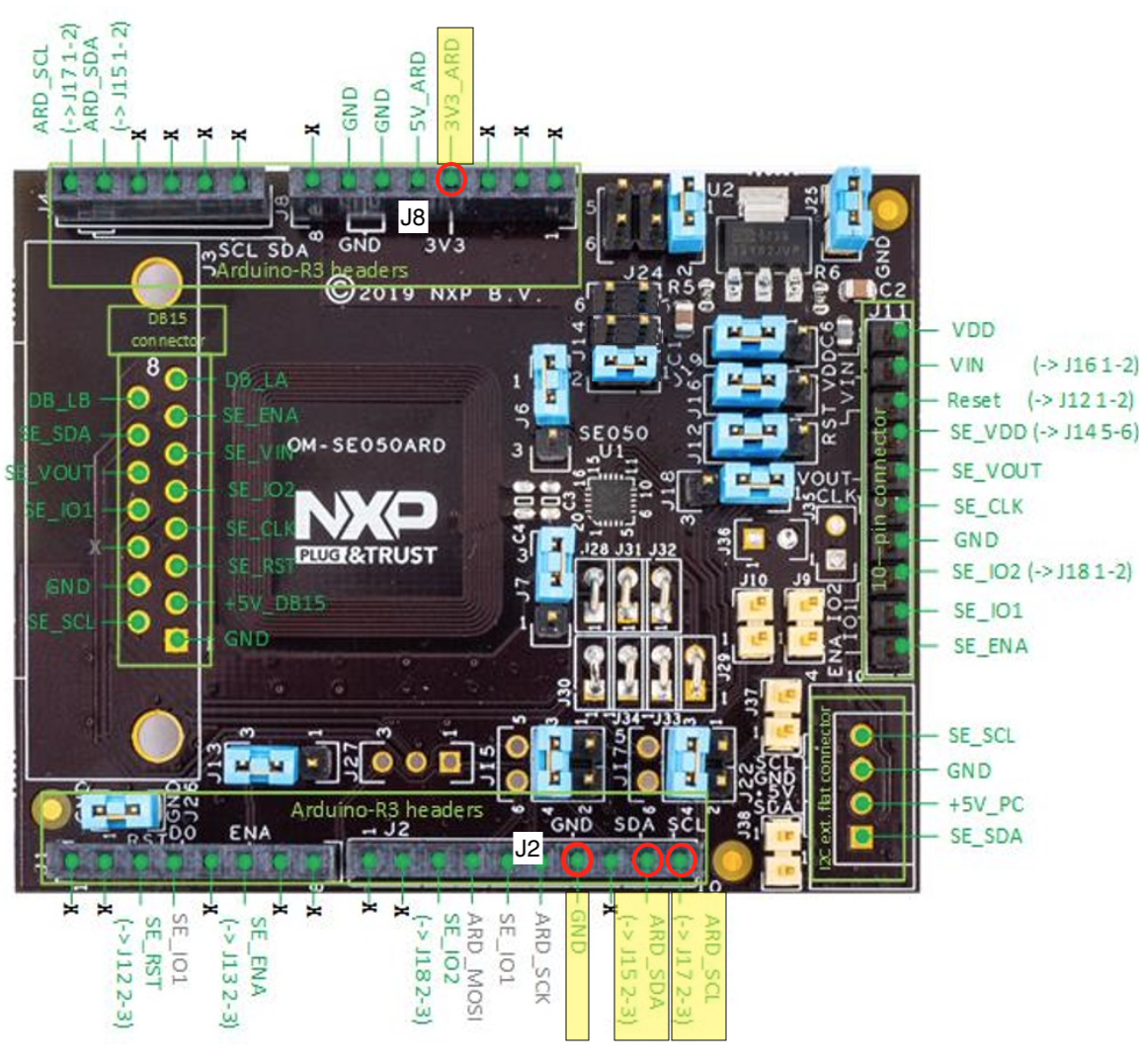 Be sure that the jumpers on the SE050 evaluation board are set as shown: