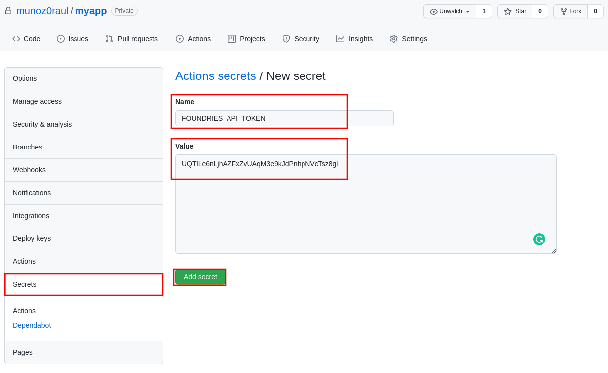 Name it with FOUNDRIES_API_TOKEN, paste your <Token> on Value and click on Add Secret: