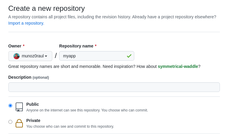 Go to GitHub and create a new repo. You can choose to use a private or public repository, each involves separate steps: