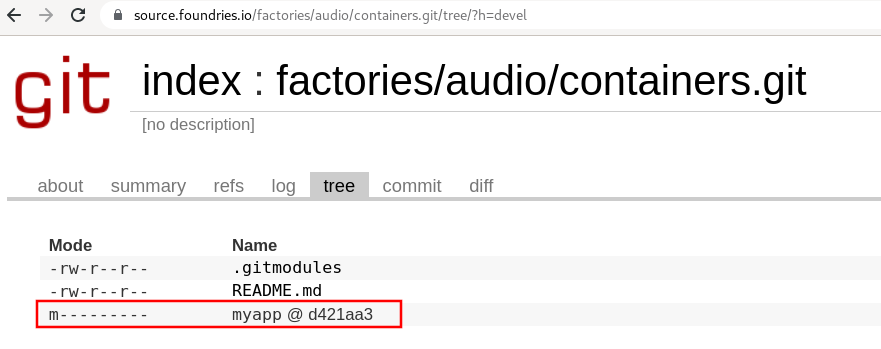 The submodule inside containers.git is pinned to the latest GitHub repo commit.